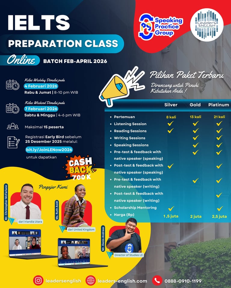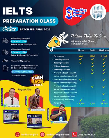 ”Awalnya saya takut dan selalu khawatir dengan soal-soal yang akan saya hadapi pada saat tes IELTS. Namun dengan persiapan bersama Leaders English, membuat saya menjadi lebih percaya diri dan mengetahui bahwa tes IELTS tidak se'menyeramkan' yang dibayangkan. Mengambil sesi persiapan IELTS dengan Leaders English merupakan salah satu pilihan terbaik yang pernah saya ambil sebelum memutuskan mengambil tes IELTS.”